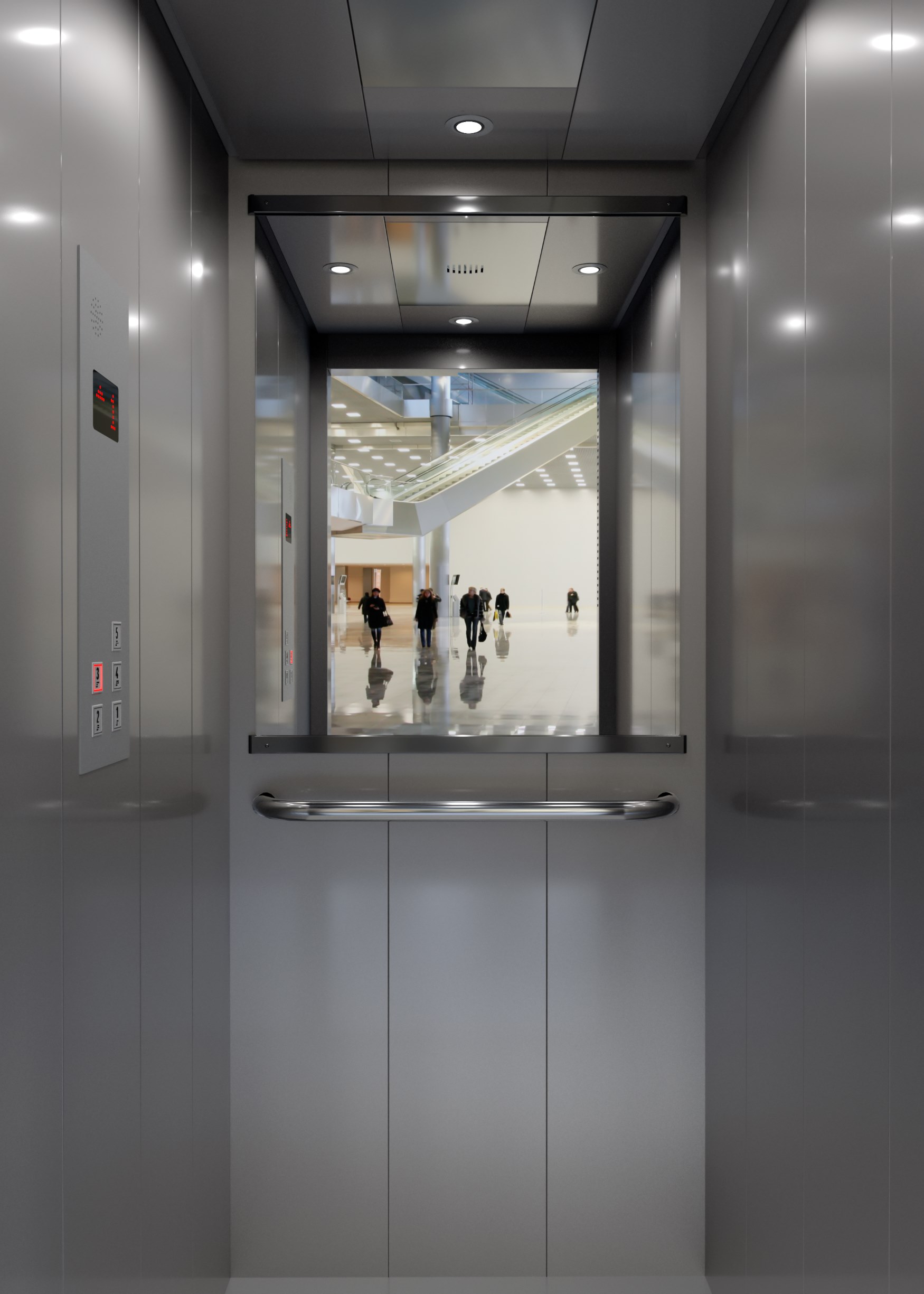 O acabamento segue o padrão de qualidade dos demais quesitos. A cabina e as portas podem ser em aço inox ou em pintura nas cores cinza ou branca, além da opção panorâmica, para projetos de design diferenciados. Ventilador, subteto em aço inox polido, iluminação LED e botoeiras com display LCD completam os itens de acabamento da cabina.